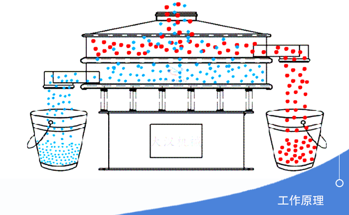 不銹鋼旋振篩分機(jī)采用直立式電機(jī)作激振源,當(dāng)篩機(jī)啟動(dòng)后,電機(jī)上、下兩端安裝的偏心重錘,將電機(jī)的旋轉(zhuǎn)運(yùn)動(dòng)轉(zhuǎn)變?yōu)樗健⒋怪薄A斜的三次元運(yùn)動(dòng),再把這個(gè)運(yùn)動(dòng)傳遞給篩面。在此過程中,小于篩面孔徑的物料通過篩孔落到下層,成為篩下物,大于篩面孔徑的物料經(jīng)連續(xù)跳躍運(yùn)動(dòng)后從排料口排出,用戶通過調(diào)節(jié)上、下兩端重錘的相位角,可以改變物料在篩面上的運(yùn)動(dòng)軌跡,從而設(shè)計(jì)實(shí)現(xiàn)對(duì)物料的篩分。