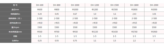 不銹鋼旋振篩分機(jī)型號(hào)有:DH-400mm、DH-600mm、DH-800mm、DH-1000mm、DH-1200mm、DH-1500mm、DH-1800mm、DH-2000mm等八種標(biāo)準(zhǔn)型號(hào)。(可以按照用戶的需求進(jìn)行特殊型號(hào)定制)