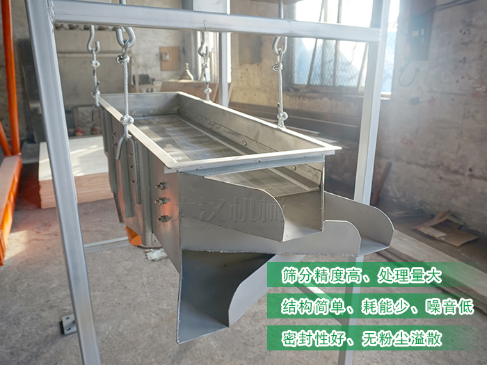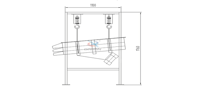 整個設備由篩箱、網架、篩網、2臺臥式振動篩電機、減震彈簧、進出料口、上蓋組成,除此之外還有高度可按需求定制的支架通過四個吊鉤把整個設備吊掛起來使其處于懸空狀態。